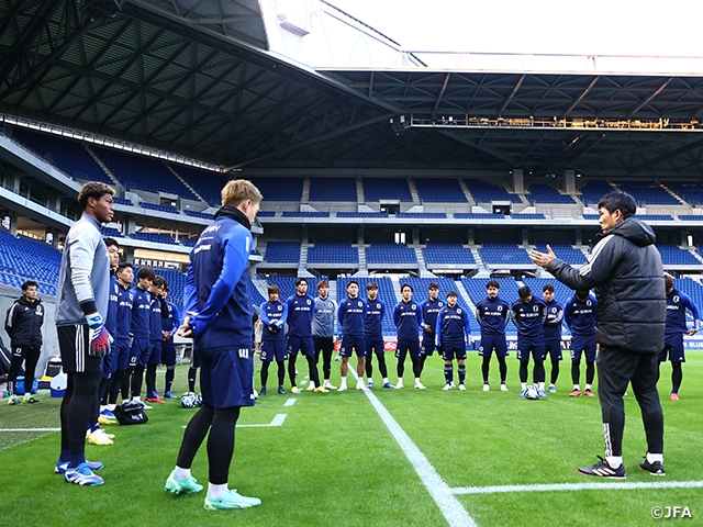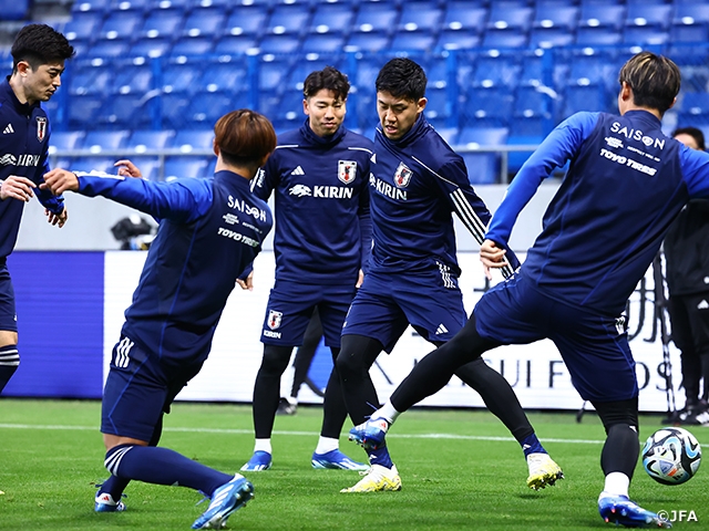 日本代表チームはこの日の午後、試合会場のパナソニック スタジアム 吹田にて最終調整に臨み、フライト欠航の影響で到着が待たれていた町田浩樹選手(ユニオン・サンジロワーズ)と渡辺剛選手(KAAヘント)も合流して元気な姿を見せました。しかし、三笘薫選手(ブライトン・アンド・ホーヴ・アルビオンFC)は怪我により、チームを離れることになりました。
