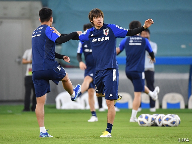 練習の最後に再び公開された部分では、ミャンマー戦でハットトリックを決めた上田綺世選手(フェイエノールト)や相馬勇紀選手(カーザ・ピアAC)、久保建英選手(レアル・ソシエダ)ら攻撃陣はシュート練習を行い、伊藤洋輝選手(VfBシュツットガルト)らDF陣は左右からのクロスボールへの対応を確認。また、遠藤航選手(リバプールFC)は黙々とランニング、GK鈴木彩艶選手(シントトロイデンVV)はロングボールの処理やフィードを繰り返すなど、各自が最後まで入念に調整していました。