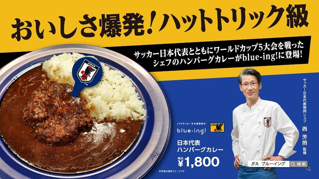 blue-ing!のCAFE&BARでは、FIFAワールドカップ5大会でSAMURAI BLUE(日本代表)に同行し、SAMURAI BLUEの戦いをサポートしたシェフ・西芳照さん監修のハンバーグカレーを数量限定で販売中です。選手やチームを「食」で支え続けてきた西シェフ特製の逸品を、この機会にぜひお召し上がりください。