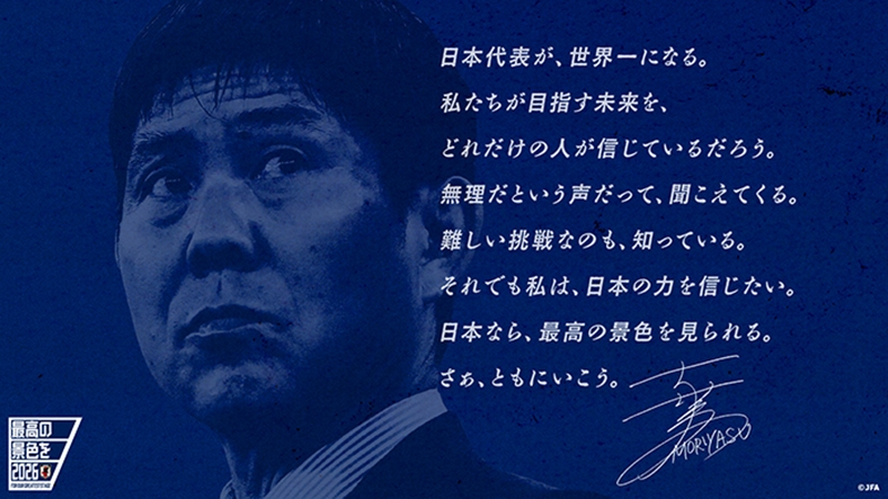 JFAは20年前の2005年1月1日に「JFA2005年宣言」を発表しました。そこにはJFAの理念とJFAのビジョン、JFAのバリューとともに、2050年までにFIFAワールドカップにおいて日本代表が優勝チームとなることを「JFAの約束2050」として記しています。約束の2050年まであと25年。この約束を果たすには、今、世界一を狙うチームでなければなりません。その「最高の景色」を求め、SAMURAI BLUEはみなさんと共に、次なる世界の舞台を戦います。