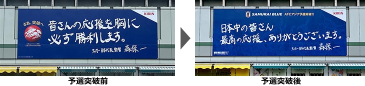 一日平均300万人もが利用すると言われる新宿駅、その南口の屋外広告に同16日から森保一監督の予選突破の決意を掲出していましたが、FIFAワールドカップ出場が確定したため、その大型広告を一夜にして貼り替え、森保監督直筆のメッセージを掲出。多くの人々と最終予選突破の喜びを分かち合うとともに、世界最高峰の舞台で「最高の景色」を求め、さらなる高みを目指します。