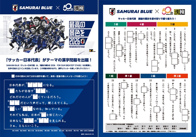 今年で創立50周年を迎える公益財団法人 日本漢字能力検定協会(以下、漢検協会)と共にSAMURAI BLUEの応援コラボレーション企画を実施します。生涯スポーツとしてのサッカーと、生涯学習としての日本語・漢字の振興を通じ、スポーツと学びの楽しさや喜びを伝えていくことを目的に実施する応援プロジェクトです。今年で30周年を迎える「今年の漢字」のJFA施設での展示や、JFAと漢検協会で共同開発した子どもから大人まであらゆるレベルの学習者が楽しめる「SAMURAI BLUE漢字検定」プリントの配布など、多くの方にサッカーと漢字に触れていただけるコラボレーションとなっています。