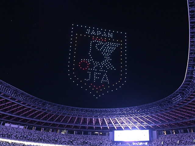 選手入場前に国立競技場の上空に約500機のドローンを放ち、日本代表エンブレムをはじめとした様々なシルエットでスタジアム上空の夜空を彩ります。