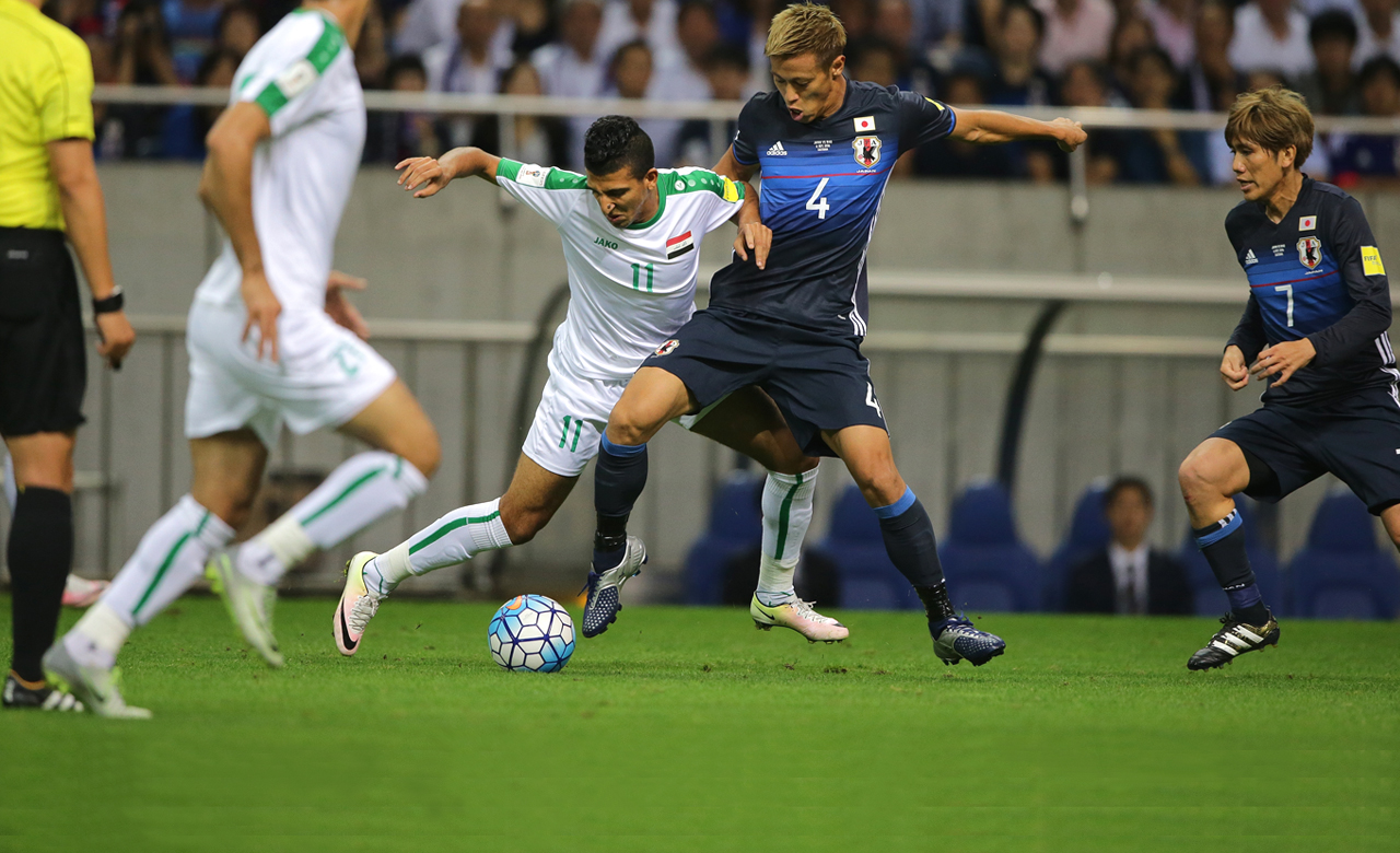 第3戦は10月6日(木)、埼玉スタジアム2002にイラク代表を迎えた。2連敗中のイラクは強い危機感を示し、立ち上がりから積極的なプレーを展開。3分にはあわやというヘディングシュートを放つなど、日本ゴールへと圧力をかける。それでも日本は次第にペースを掴むと、23分、本田選手の折り返しを原口選手がヒールで合わせて先制に成功。その後も次々に決定的チャンスを迎えたが、相手GKの好セーブにあい、追加点を奪えなかった。