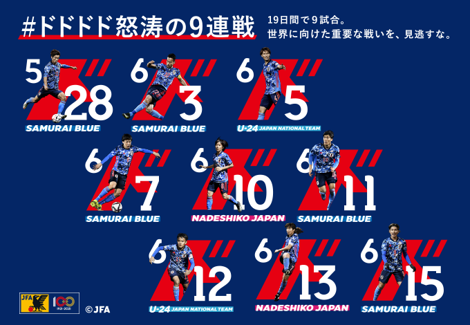 2021年5月28日(金)のSAMURAI BLUE 対ミャンマー代表を皮切りに、6月15日(火)までの19日間で怒涛の9連戦を戦う日本代表。