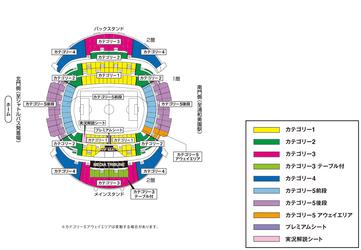 - カテゴリー5ゴール裏南側のカテゴリー5とアウェイエリアの境界線は変動する場合があります。
