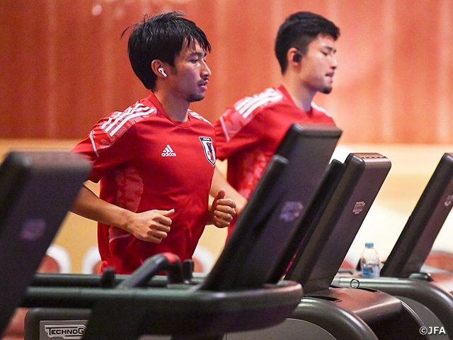 トレーニングを行うには遅い時間となったため、選手たちは各々がホテルのジムで汗を流しました。有酸素運動でリカバリーする選手、試合まで日数があることも考慮し、筋力トレーニングに励む選手もいました。