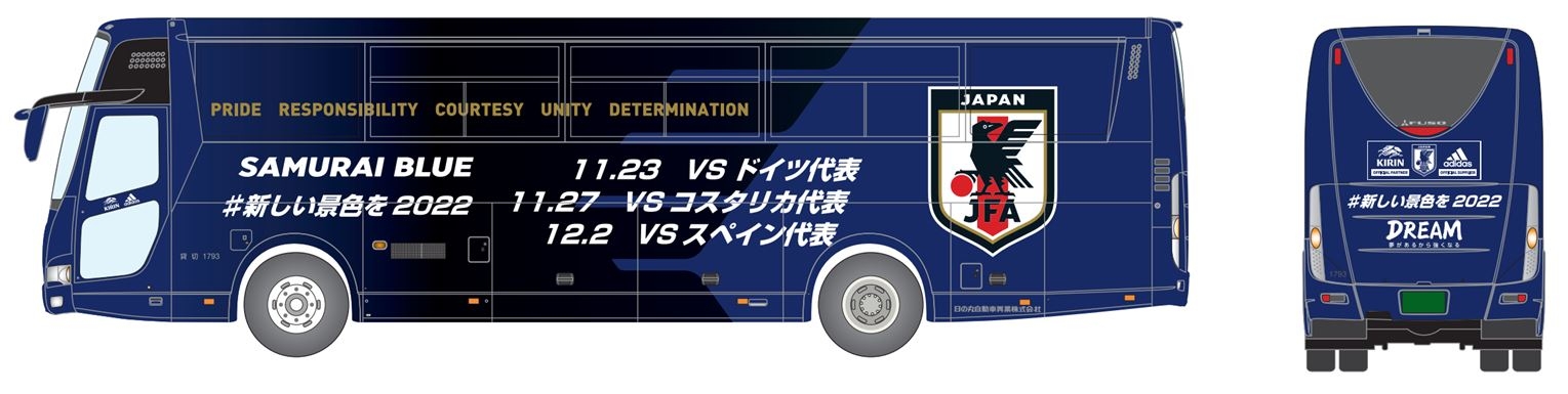 日本サッカー協会(JFA)は、サッカー日本代表オフィシャルチームバス「JFA's DREAM」を活用した、「新しい景色を2022バスプロモーション」を、11月23日(水・祝)、27日(日)に渋谷・原宿近郊で行います。バスは、2021年9月に発表したもので、JFAブルーを基調に三本足の烏の羽をモチーフにしたサブグラフィック、日本代表エンブレムが描かれています。窓の部分には日本代表が大切にすべき共通の価値観「日本代表アイデンティティ」5つのキーワードが記されています。今回は、側面に11月の試合日程を施した特別バージョンでの運行となります。