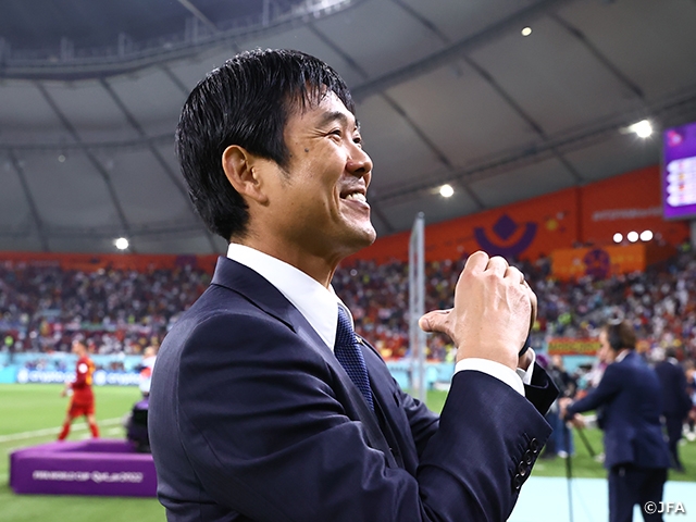 世界最高峰の実力のあるスペインとの戦いは難しく厳しくなることは予想していましたし、実際に難しい試合展開でしたが、選手たちが1失点したあとも、自分たちの戦いに持っていこうと粘り強く戦ってくれました。前半、粘り強く我慢強く戦ってつなげてくれる選手がいたからこそ、後半良い攻撃に移っていくことができました。選手たちがコスタリカ戦から気持ちを切り替えて最高の準備をし、粘り強く最後まで戦うことで勝つ確率を上げてくれました。現地で、日本で、サポーターが応援してくれたおかげです。国民のみなさんに勝利を届けられてうれしく思います。