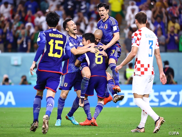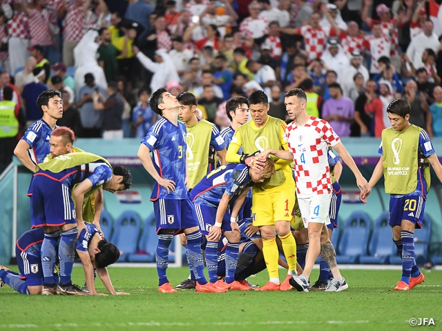 FIFAワールドカップカタール2022に臨んでいるSAMURAI BLUE(日本代表)は12月5日(月)、アルジャヌーブスタジアムで行われたラウンド16で前回大会準優勝のクロアチア代表と対戦。前田大然選手(セルティック)のゴールで前半1-0とリードを奪いましたが、後半追いつかれ、延長1-1の末にもつれ込んだPK戦で1-3と敗れて敗退となり、初の8強進出は次回2026年大会以降に持ち越しとなりました。