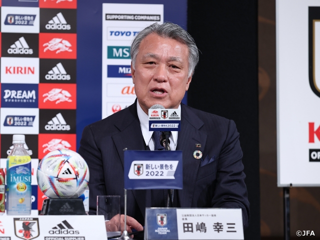FIFAワールドカップカタール2022で全てを発揮してくれた森保監督をはじめ選手たちに感謝したいと思います。テレビやラジオなどさまざまな媒体を通じてSAMURAI BLUEを応援してくださった方、ドーハに来て応援してくださった方、サッカーに関心を持ってくださった方に感謝します。JFAは2006年から「Japan's way」を掲げ、日本の素晴らしさ、長所を理解し、育成年代からその長所を伸ばすために活動してきました。今大会を通じて、継続すること、本気で目標を実現させようとすることの大切さをあらためて感じました。2050年までにワールドカップを日本で開催し、その大会で優勝するという目標に着実に近づいているとカタールで実感することもできました。大会では、長友(佑都)選手が「ブラボー」と言っていました。欧米ではよく使われる言葉ですが、身近で起こったことを素直にたたえられる世の中になってほしい。自分の夢を堂々と語ることが当たり前の日本になってほしいと思います。最後に、人を信じることの大切さ、森保監督が選手たちを信じたからこそ力が発揮されたのだと学ばせてもらいました。あらためて、国民の皆さま、関係者の皆さまに感謝の気持ちをお伝えします。