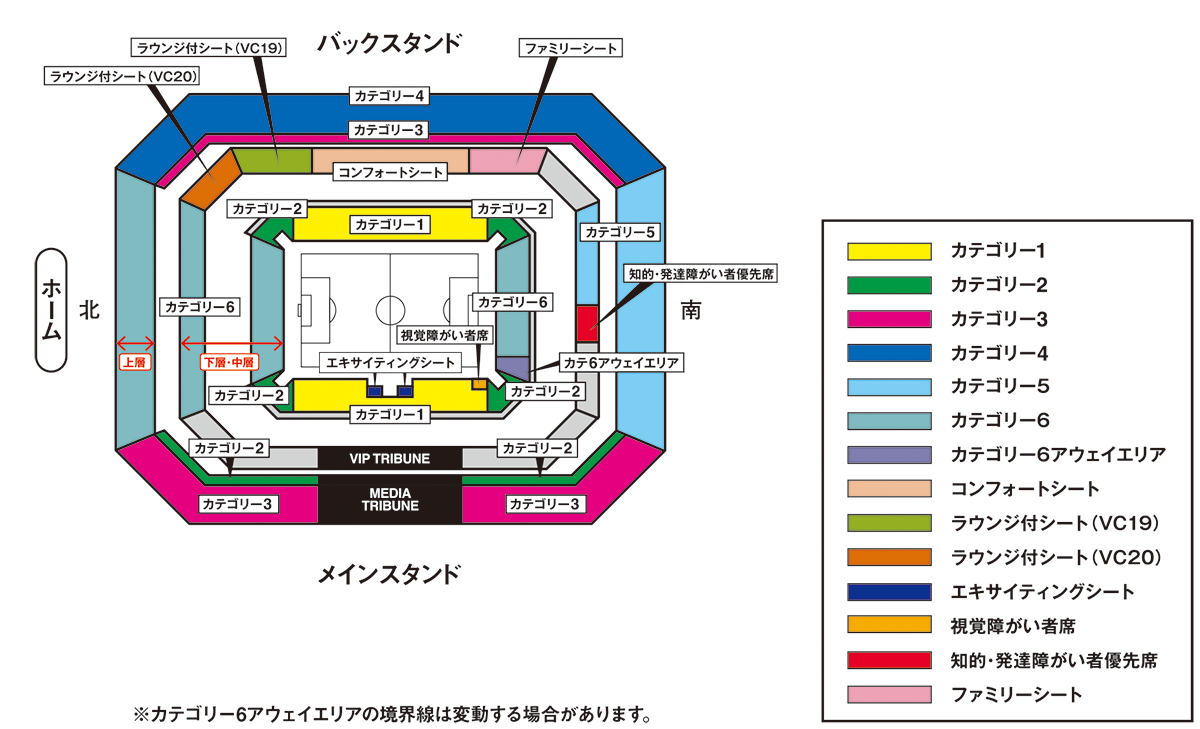 - カテゴリー6(ゴール裏・南下層)とカテゴリー6(アウェイエリア)の境界線は変動する場合があります。