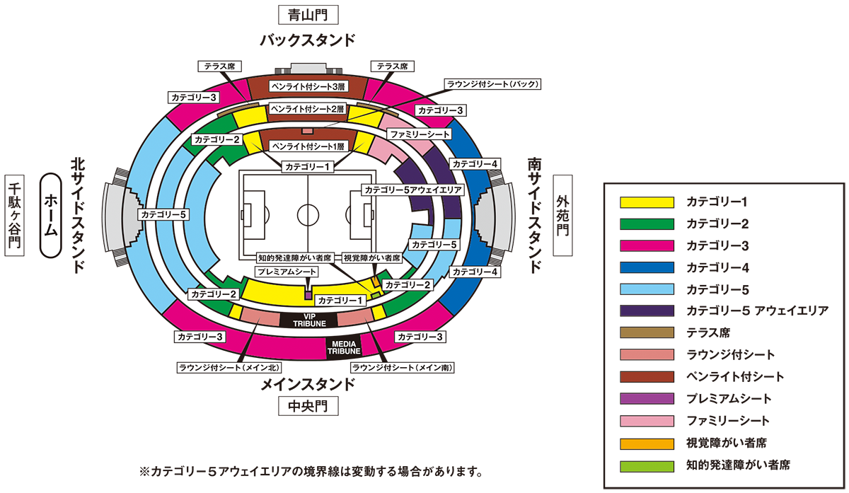 - ・カテゴリー5(ゴール裏南)とカテゴリー5(アウェイエリア)の境界線は変動する場合があります。