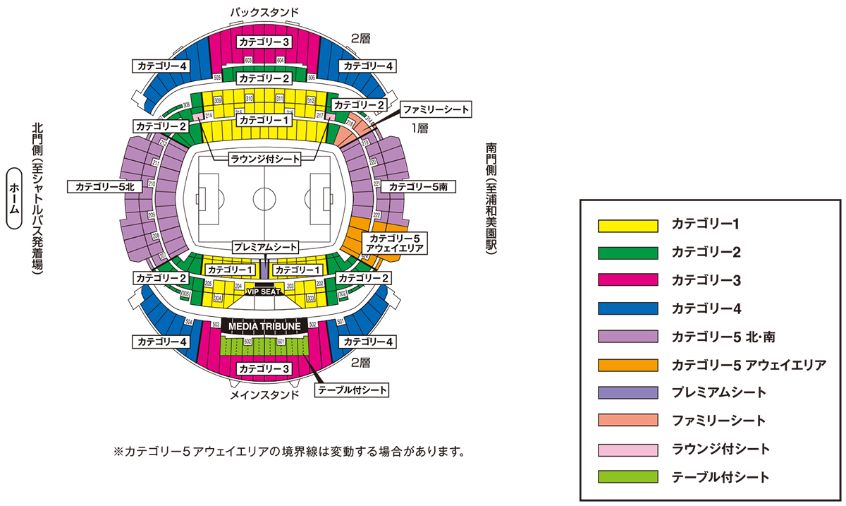 - ・カテゴリー5(ゴール裏南)とカテゴリー5(アウェイエリア)の境界線は変動する場合があります。