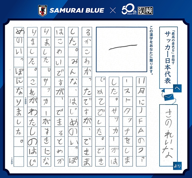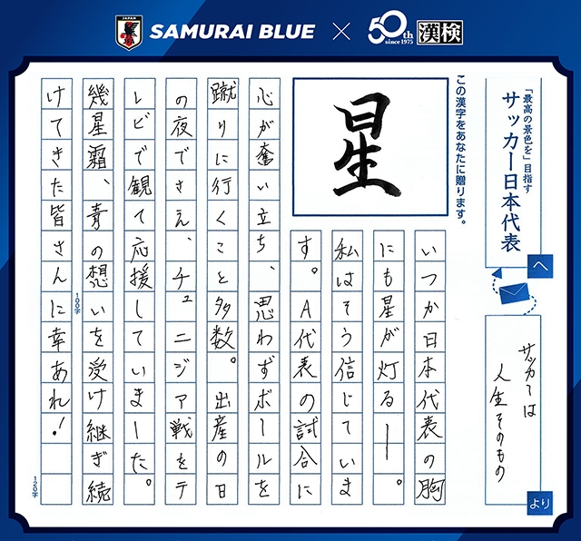 受賞作品の詳細は、コンテストサイト(URL:https://www.kanken.or.jp/kanji-contest/jfa-samuraiblue/)をご覧ください。