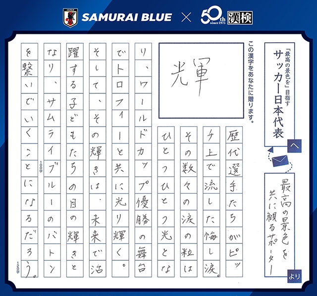 当協会は今後も、漢字を通じて「最高の景色」を目指すサッカー日本代表を応援してまいります。