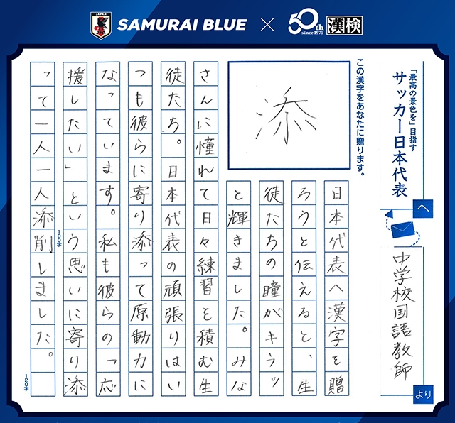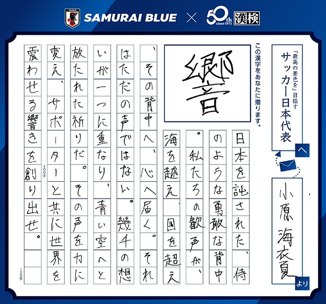 「今、あなたに贈りたい漢字コンテスト」は、漢検協会が2013年から実施しているもので、普段言えない素直な気持ちを込めた「漢字一字とメッセージ」を募集し表彰するコンテストです。このコンテストの特別版として、2025年9月30日から2026年1月16日の期間で、FIFAワールドカップ2026に臨むSAMURAI BLUE(サッカー日本代表)への想いを込めた「漢字一字と応援メッセージ」を募集しました。