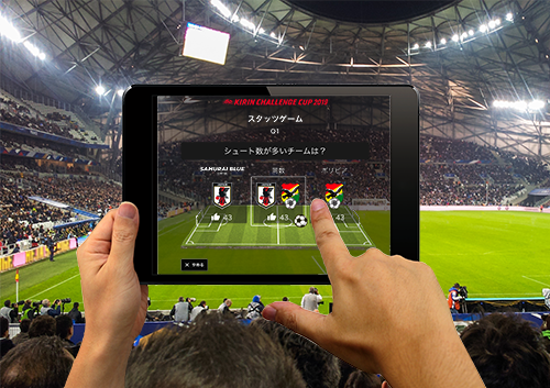 XRテクノロジー導入の第1弾として、2019年3月26日「キリンチャレンジカップ2019」日本対ボリビア戦では、AR技術を活用した「ARサッカー観戦」のサービスをスタジアムの一部シートで実施します。本施策では、様々な角度からのカメラ映像観戦に加え、スタッツを用いた試合結果の予想、ハーフタイム中に楽しめるカジュアルARゲーム「KIRIN CHALLENGE CUP キックターゲット」が、自席に設置されたタブレットでお楽しみいただけます。