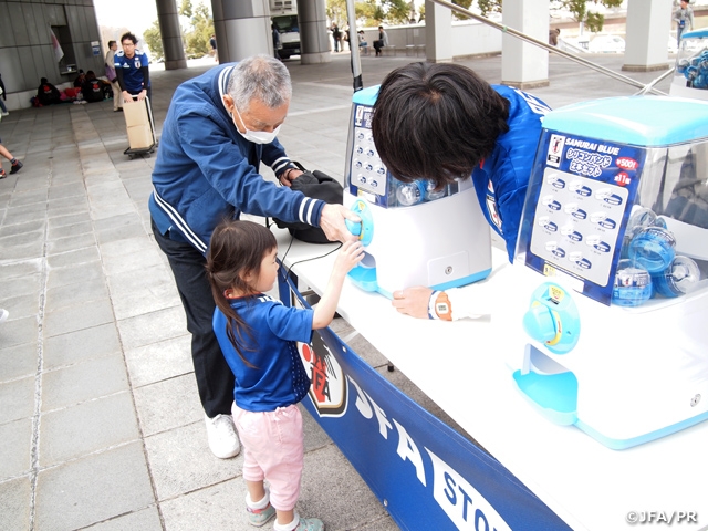 JFAストアではオフィシャルグッズやSAMURAI BLUEカプセルガチャも販売。じぃじも孫たちにねだられながら嬉しそうにお土産を購入。