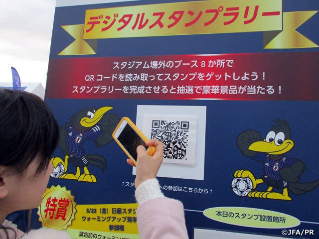 クレディセゾンブースでは、母がそういえばこのカード持っていなかったわ!との事で、カードを作成し日本代表のタオルを頂きました。息子は先程のユニフォームとタオルを手に入れてご機嫌でした。このクレディセゾンブースで親切なスタッフの方がデジタルスタンプラリーのやり方を説明して下さったので子供たち三人で冒険するようにQRコードを各ブースで探して歩いて参加しました。