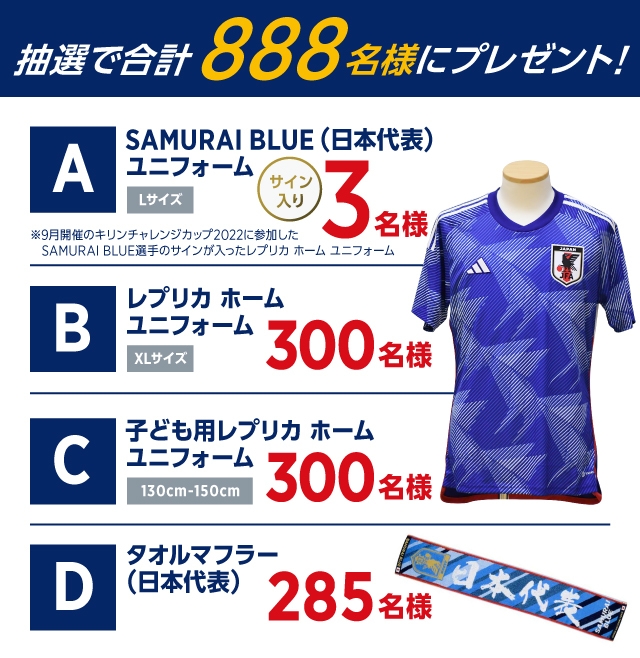開幕目前!SAMURAI BLUE(サッカー日本代表)がベスト8へ壁を超えていくため、より多くの方に応援をしていただくことを目的に、合計888名様に当たるプレゼントキャンペーンを開催いたします。