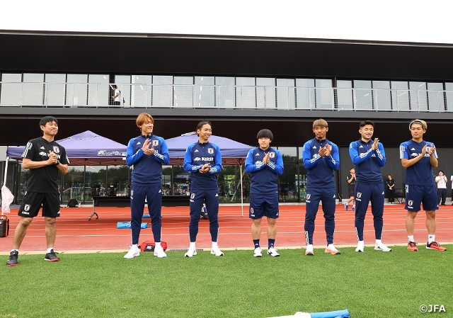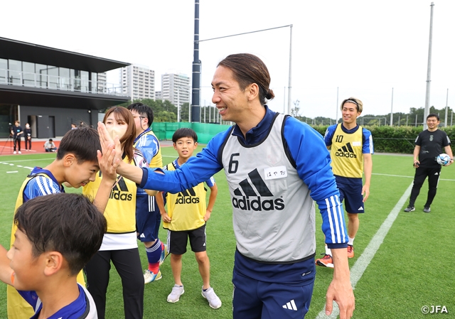 JFA公式アプリ JFA Passportとadidas会員プログラム adiClubから応募いただき、当選した方々が、SAMURAI BLUE(日本代表)森保一監督と、川辺駿選手、菅原由勢選手、中村敬斗選手、相馬勇紀選手、守田英正選手、瀬古歩夢選手の6選手と一緒にウォーキングフットボールを楽しみました。