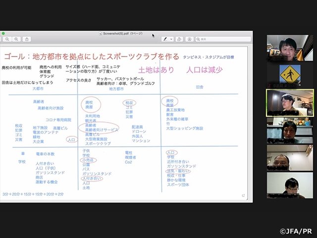 本コースは佐伯仁史インストラクター(NPO法人富山スポーツコミュニケーションズ 理事長)にご担当いただき、「ビジョン」「環境分析」「コミュニティデザイン」「SWOT」「行動計画」「目標管理」の計6セッション(全18時間)を実施しました。