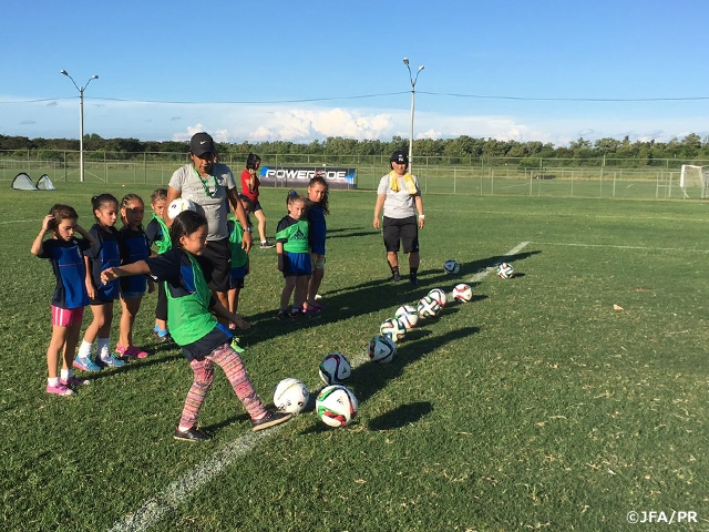 フェスティバルには、6歳から12歳までの地元の女の子が約100名が参加。また、参加者を指導する立場として、JFAの山口小百合ナショナルトレセンコーチを始め、パラグアイサッカー協会に所属する女性指導者が10名、パラグアイのクラブチームに所属する関係者が10名、チリサッカー連盟の女性指導者が1名、ウルグアイサッカー協会の女性指導者が1名参加、さらにサポート役としてU-20パラグアイ女子代表及びU-17女子代表より約20名の選手が参加しました。