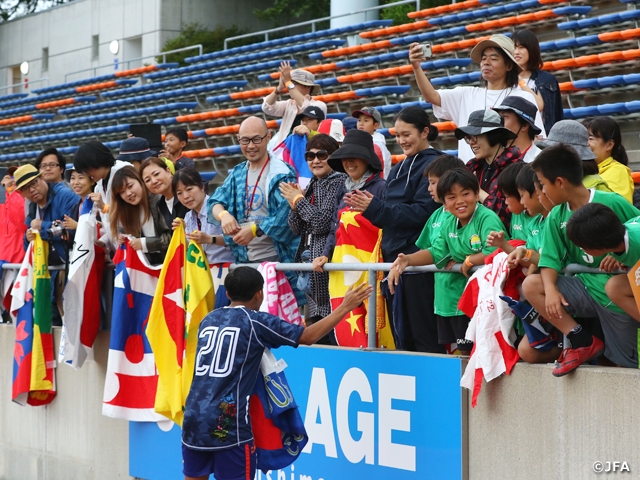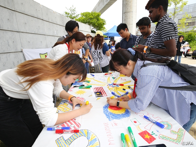 6月22日に福島県Jヴィレッジにて、国際交流基金アジアセンターとの共催で、東南アジア11カ国から編成された選抜チーム「ASIAN ELEVEN U-18東南アジア選抜」とU-18東北選抜のJapaFunCupの試合が行われ、マッチフラッグがバックスタンドを埋め尽くしました。東京藝術大学や代々木公園で開催されたラオスフェスティバル2019で、学生や一般参加者と共に、11カ国のそれぞれのナショナルフラッグと日の丸の二つを一枚のフラッグにデザインし、縦110センチ幅180センチの旗を40枚制作しました。