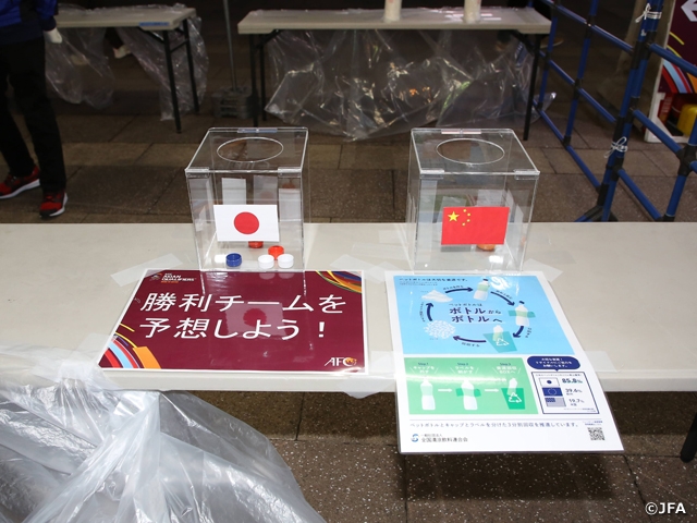 JFA SDGsブースでは、アスパス!の5つの重要課題のパネルなどを展示。また、ペットボトルの分別と水平リサイクルの大切さを啓発し、キャップを使った勝利チームの予想コーナーを設けました。