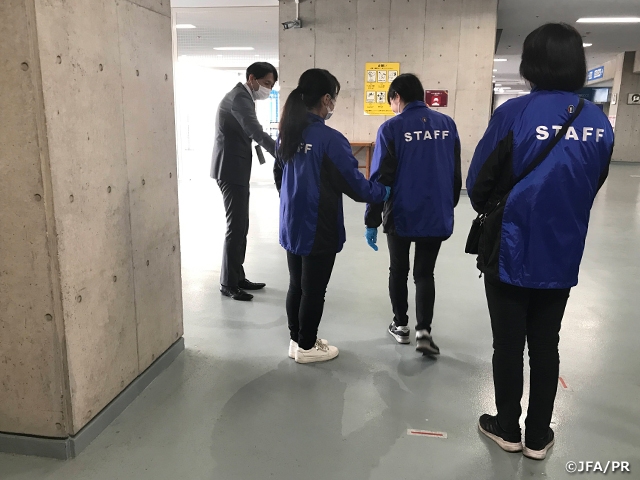 実況解説シートは、2021年3月25日のSAMURI BLUE国際親善試合(日産スタジアム)、26日のU-24日本代表SAISON CARD CUP 2021(東京スタジアム)以来の実施となりました。実施にあたっては、視覚障がいのある皆さんが観客席まで安心して移動できるよう、会場のスタッフが公益財団法人日本ケアフィット共育機構の冨樫正義さんからレクチャーを受けて臨みました。