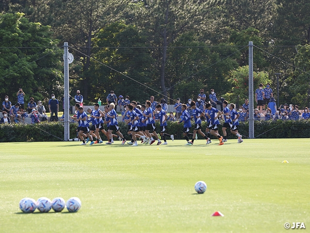 そしてクリーン活動後にはピッチ横のサポーターズヒルから日本代表のトレーニングを見学しました。ウォーミングアップのランニング中、参加者に向けて一礼したり手を振る代表選手もおり、普段はなかなか見られないトレーニングの様子に参加者の皆さんも時には拍手をあげながら、約90分間のトレーニングに最後まで釘付けとなっていました。