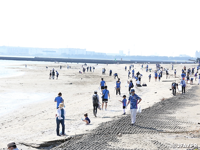 「アスパス!ビーチクリーン」は社会貢献活動の一環として、日本財団と環境省が推進する「海ごみゼロウィーク」にJFAも賛同し、行っているものです。5月にビーチサッカー選手とJFA役職員が行った活動に続き今回で2回目となりました。さらに今回は日本代表オフィシャルサプライヤーのアディダス社が展開する「RUN FOR THE OCEANS(ラン・フォー・ジ・オーシャンズ)」と連動し、参加者のごみ回収活動時間が走行時間としてカウントされ、10分間ごとにプラスチックペットボトル1本分の重量相当のプラスチックゴミが回収される取り組みとなりました。