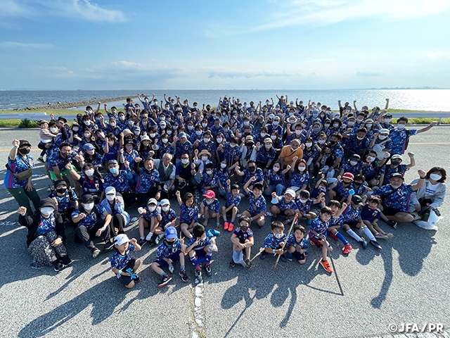 6月4日(土)、高円宮記念JFA夢フィールドのある幕張海浜公園と周辺の海岸エリアで「アスパス!ビーチクリーン 日本代表ユニフォームでビーチクリーンとトレーニング見学に参加しよう!」を実施しました。天気に恵まれ気持ちのよい青空の下、近隣地域の皆さま、ファン・サポーターの皆さま、日本代表スポンサー各社の皆さま、JFA関係者・役職員の合計176名が参加し、ビーチクリーン活動とキリンチャレンジカップ2022のブラジル代表戦に向けて準備するSAMURAI BLUE(日本代表)のトレーニングを見学しました。
