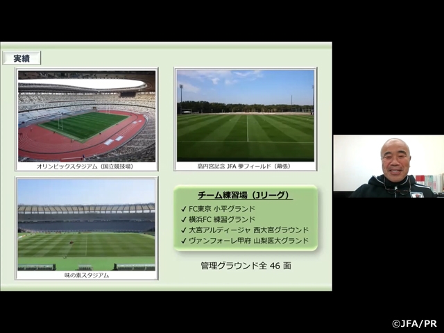 第6回(1/20)、第7回(2/3)は日本のグラウンドキーパーの第一人者である㈱オフィスショウの池田省治代表をゲストスピーカーに迎え、「目的に応じた天然芝の整備と維持管理」をテーマに、幼稚園・保育園の園庭や学校の校庭、地域のサッカー場、プロが興行を行うスタジアムまで、あらゆる芝生を導入・管理されてきたお話を伺いました。前編では天然芝を導入、維持管理していく上で大切な基礎および目的から逆算した設計と設備の大切さを、後編ではJFAとともに取り組むポット苗方式の芝生化や、良質なピッチを維持するための工夫を伝え、参加者からの質問や相談に答える形で終了しました。