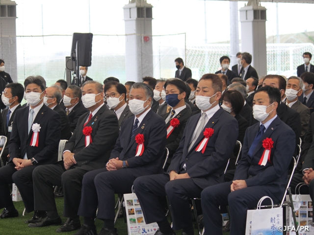 富山県射水市では、人工芝のサッカーピッチ2面、全天候型フットサルピッチ1面とクラブハウスを備えたフットボールセンターが完成し、その落成式が4月29日、夏野元志射水市長など地元の関係者や田嶋幸三JFA会長が出席して行われました。落成式では、夏野市長の式辞のあと、田嶋会長ら来賓の祝辞があり、元サッカー日本代表の柳沢敦氏(同市出身)、本田圭佑氏のビデオメッセージが上映されました。