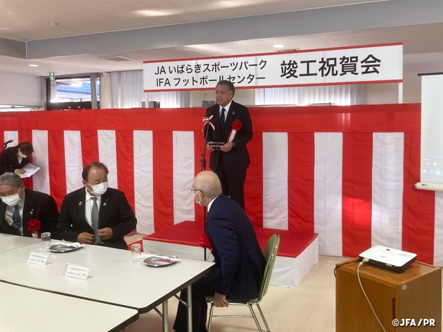 本日ここに、JAグループ茨城教育センターの新グラウンド「JAいばらきスポーツパーク/IFAフットボールセンター」が無事に竣工し、こうして皆様にお披露目出来ますのも、茨城県サッカー協会をはじめ、日頃からご支援、ご協力頂いております地元国田地域の皆様、そして、日本体育施設株式会社様をはじめとした、工事にたずさわってくださった皆様のご尽力の賜物と、心から感謝申し上げます。