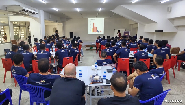 初日は小野副技術委員長による世界のフットボールのトレンド、菅野フィジカルフィットネスリーダーによるフィジカルフィットネスによる講義・実技講習が行われました。実技指導では、ミャンマーサッカー連盟ヤンゴンアカデミーU-15の選手がサポート選手としてフィジカルトレーニングを中心としたインテンシティの高いトレーニングメニューを行い、ピッチ上でも活発な意見交換が行われました。