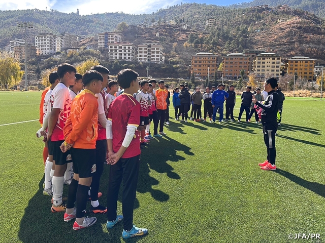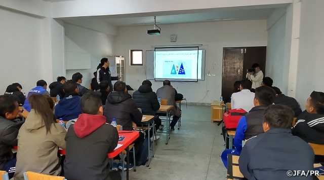 ブータンサッカー連盟の協力で2日間のコーチングセミナーを行いました。1日目は「世界のフットボールのトレンド」、2日目は「ユース育成」をテーマにグループワークやディスカッションを入れながら参加型で行いました。また、ピッチではブータンアカデミーの選手に参加してもらい「ボールを奪う」をテーマにコーチングデモンストレーションを行い、参加者に発問しながら意図を説明しました。ブータンサッカーが成長するためにどうしたら良いかを参加者と一緒になって講習会を進めることができました。これもブータンの指導者の皆さんが、積極的に講習会に取り組んでくれたおかげでした。今後も、ブータンサッカー連盟とJFAとの良好な関係をさらに発展させて、アジア全体のレベルアップにもつながることを願っています。最後にこのような機会を与えてくださったJSC(スポーツ振興くじ)そして、温かく迎えてくれたブータンサッカー協会の皆様に感謝いたします。