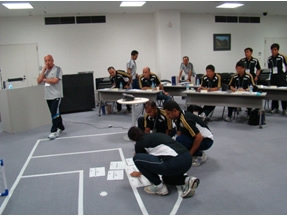 JFAインストラクターによって競技規則のプレゼン、プラクティカルトレーニング、フィジカルトレーニングを実施。 山岸氏のフィジカルトレーニングは、楽しさの要素が取り入れらており、参加者は楽しんでトレーニングに参加していた。 【Group work】では、参加者を5グループに分け、それぞれにJFAインストラクターが1名付き、プレゼン、プラクティカルの事前準備のアドバイスを行った。夜遅くまで準備を行っていたグループもあり、真剣にとりくんでいる様子が見られた。 |