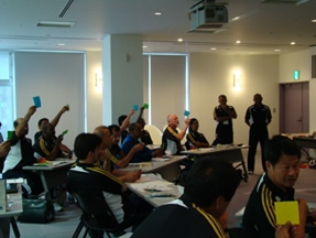 内容としては、日本の審判界の取り組みの紹介、日本のインストラクターによる、理論・実技の各講義のデモンストレーション、そして、参加者による両講義の実施、そして、Jリーグの試合を見て、レフリングアセスメントの実施というものでした。いずれも参加者の評価は良好であり、来年以降も実施して欲しいという声が全員から聞かれました。