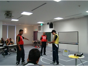 終日をかけて、各グループがそれぞれにプラクティカルトレーニングを実施。通訳を介しての説明や指示が、上手く審判員やプレーヤーに伝わらない場面が多く見られたが、一生懸命に行っている様子は印象的であった。 プラクティカルトレーニング終了後に参加者全員で行ったフレンドリーマッチでは、とても楽しんで盛り上がっていた。 |