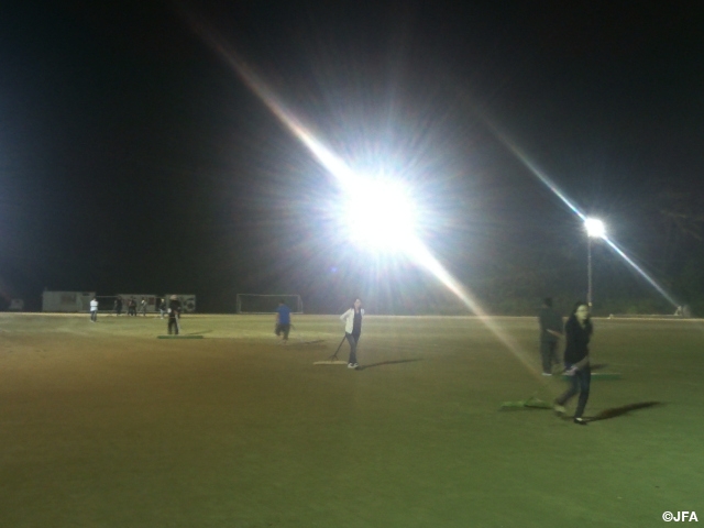 現在使用している寺野地区の小学校・中学校の合同仮設校舎のグランドはいずれは住宅地になりますし、近くには病院も建つことが決まっています。新校舎は、沢山地区の大槌町で唯一サッカーの試合ができる大槌高校グラウンドに小・中学校の一貫校が建設されることが決まっていますが、建設業者が未だ決まっておらず、着工の目処もまだついていません。新校舎移転まで3~4年かかるということで、町役場からは、現在使用している寺野地区の仮設グラウンドのナイター設備を復旧してもらいました。昨年は、照明器がひとつだけで、ピッチの一角だけが照らされ薄暗い状態でしたが、今年から明るさも増して環境も良くなりました。Jリーグの支援の簡易照明が役立ちました。その支援にも感謝致します。