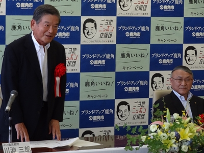 8月3日(金)「ご当地ニッポン応援団」×「鹿角いいね!キャンペーン」の合同記者発表を行い、川淵三郎最高顧問、児玉一鹿角市長が出席しました。