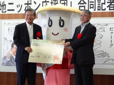 鹿角市のゆるきゃら「たんぽ小町ちゃん」が見守る中、鹿角市 児玉市長から川淵キャプテンへ鹿角観光ファンVIP認定証が贈られました。