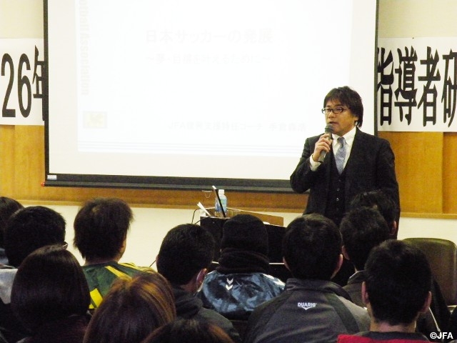 2月7日、石巻地区で活動するスポーツ少年団の各指導者が集まり、指導者研修会が行われました。この研修会は毎年開催されているもので、今回は私が、『日本スポーツの発展』をテーマに、これまでの日本サッカーの発展と日本の目標であるFIFAワールドカップで優勝するための取り組みについて講演させていただきました。