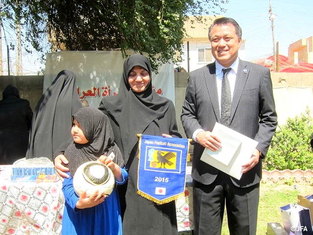 日本サッカー協会(JFA)は4月14日、イラク・バグダッドのNGO「イラク女性基金」にて、戦争やテロリズムで孤児となった子どもたちにサッカーボールを寄贈しました。寄贈式典には在イラク日本大使館梨田和也大使も出席。田嶋幸三JFA副会長からイラクの孤児の子どもたちにボールが手渡されました。さらに今回の訪問では、イラクサッカー協会および難民キャンプにもボールが贈られました。