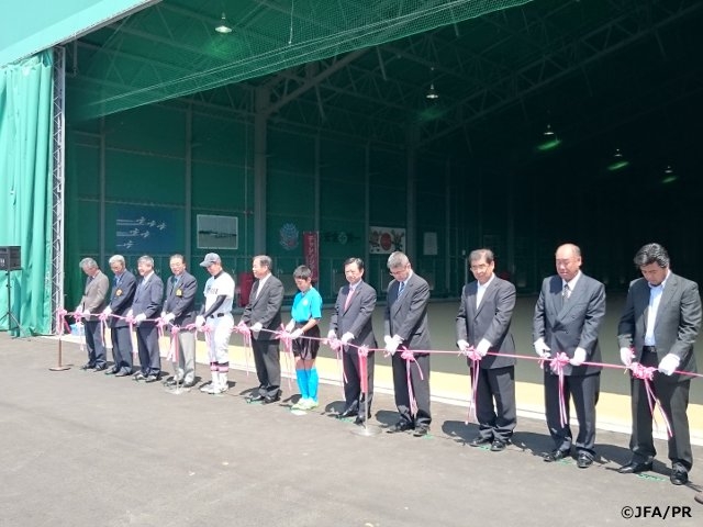 24日は東松島市へ。鷹来の森運動公園に建設された運動場のオープンセレモニーに出席しました。鷹来の森は三陸道矢本インターから内陸へ10分ほど入った高台にあり、野球場が2面と、多目的グラウンド、ソフトボール場があります。そこに今回、運動場が完成しました。運動場は、東松島の航空自衛隊アクロバット飛行するブルーインパルスの格納庫2棟(A棟・B棟)を譲り受けてできたもので、予定より約半年遅れで完成。セレモニーでは、東松島サッカースポーツ少年団の佐藤涼キャプテンが、「屋内練習場ができて、天候に左右されず練習できるのでとても嬉しいです」とお礼の言葉を述べました。