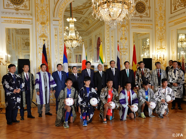「日本-メコンU-15サッカー交流プログラム」 最終日は、活動の場を大阪から東京に移し、各国チームの代表者及びチームキャプテンが第7回日本・メコン地域諸国首脳会議で来日中の首脳陣と迎賓館で面会しました。各国の首脳より、直筆サイン入りボールとハッピが代表者及びキャプテンへ贈呈され、記念撮影を行いました。それ以外のメンバーは、今回の交流プログラムを共催している国際交流基金アジアセンター主催の書道教室を体験しました。初めて触れる毛筆に戸惑いながらも、周囲の仲間と見せ合いをしながら自分の名前をひらがなで見事に色紙に書き上げました。サッカーだけではなく、昔から続く日本の伝統文化を体感し、他国の選手たちと交流を深めていました。