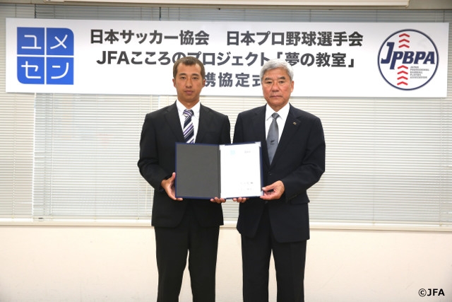 日本サッカー協会(JFA)と日本プロ野球選手会(JPBPA)は、子どもたちに「夢をもつことの大切さ」や「失敗や挫折に負けない心の強さ」を伝えるため互いに協力することを目的として、JFAこころのプロジェクト「夢の教室」の共同実施に係る協定を締結しました。